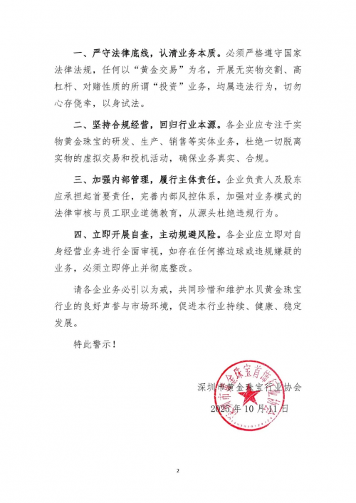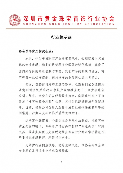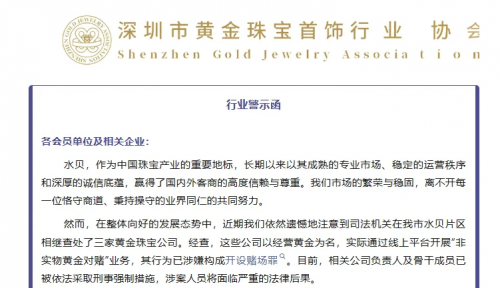 10月11日,深圳市黄金珠宝首饰行业协会发布官方警示函,披露深圳水贝片区三家黄金珠宝公司因涉嫌开设赌场罪被司法机关查处。这是继9月中旬水贝10余家黄金料商经营异常、人去楼空引发行业“大地震”后,该片区一个月内出现的第二起重大行业风波,再度将黄金市场的违规交易乱象推向公众视野。 图片来源于深圳市黄金珠宝首饰行业协会 警示函明确指出,涉案公司以“经营黄金”为幌子,实际通过线上平台开展“非实物黄金对赌”业务。其运作模式为:诱导客户以黄金价格波动为标的,进行无实物交割的高杠杆“买涨买跌”投机交易,公司与客户构成直接对手方关系——客户亏损即平台盈利,形成典型的“对赌”结构,已完全脱离黄金珠宝行业正常经营范围,涉嫌构成开设赌场罪。目前,相关公司负责人及骨干成员已被依法采取刑事强制措施,将面临严重法律后果。 疯狂金价下的“赌场”陷阱:低门槛高杠杆引散客入局 近期国际金价强势攀升,深圳水贝金饰克价已突破900元。金价高企催生市场异动,除借货、代卖、寄售等模式引发纠纷外,长期潜伏于水贝市场的“私盘对赌”“违规场外流通”等风险模式集中爆发。 涉案的“非实物黄金对赌”业务,本质是打着黄金交易旗号的“猜涨跌”赌博。与合法投资不同,其核心特征是“三无”:无实物交割、无合法金融牌照、无监管。具体运作中,部分线上平台以“1克起订、20元定金撬动近千元黄金”的高杠杆模式吸引散客,业务人员通过社交平台引流,并在群内安插“托”晒单营造盈利假象,甚至以交易提成、回扣激励层层推动,将大量风险认知不足的散户卷入其中。 这种模式隐藏双重风险:对投资者而言,缺乏有效风控下,金价波动可能导致瞬间巨亏;对平台而言,若未充分对冲风险,金价单边行情可能引发资金链断裂,最终导致平台“跑路”,投资者血本无归。 “黄金对赌”非创新:脱实向虚触碰法律红线 此类“黄金对赌”业务究竟是“金融创新”还是“违法犯罪”?从业务实质看,其早已触碰法律与行业底线。 从交易客体看,合法黄金珠宝业务以实物交割为核心,聚焦黄金的商品属性与使用价值;而“对赌”模式中,黄金仅为计价符号,客户目的是投机价格波动,完全“脱实向虚”,背离行业经营本源。 从交易结构看,高杠杆与“对手方对赌”是核心。平台作为客户的直接交易对手,双方形成“你亏我赚”的零和博弈,这与赌场中庄家和赌徒的关系在法律实质上高度一致,并非所谓的“投资”,而是典型的赌博行为。 协会发四禁令:严守合规,回归实体本源 为遏制行业乱象,维护市场秩序,深圳市黄金珠宝首饰行业协会向全体会员及行业企业发出四点警示: 1. 严守法律底线:明确无实物交割、高杠杆、对赌性质的“黄金交易”均属违法,严禁心存侥幸、以身试法。 2. 回归行业本源:企业需专注实物黄金珠宝的研发、生产、销售等实体业务,杜绝虚拟交易与投机活动。 3. 强化内部管理:企业负责人及股东需承担首要责任,完善风控体系,加强业务法律审核与员工职业道德教育。 4. 立即自查整改:全面审视自身业务,对擦边球、违规嫌疑业务立即停止并彻底整改。 协会强调,各企业需引以为戒,共同维护水贝黄金珠宝行业的声誉与市场环境,推动行业持续健康稳定发展。 图片来源于深圳市黄金珠宝首饰行业协会 资料来源:企业供稿
