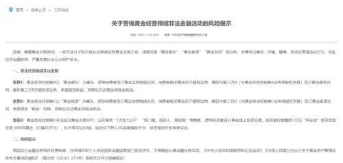 11月24日,深圳市委金融委员会办公室发布《关于警惕黄金经营领域非法金融活动的风险提示》(以下简称《风险提示》)。 近期,随着黄金价格波动,一些不法分子和不良企业假借实物黄金交易之名,违规开展“黄金委托”“黄金租赁”“黄金投资”等业务,涉嫌非法集资、诈骗、赌博、非法经营等违法行为,扰乱经济金融秩序,严重危害社会公众财产安全。 图片源于中共深圳市委金融委员会办公室 具体而言,《风险提示》中给出了三个典型案例: 案例1:黄金珠宝经销商A以“黄金委托”为噱头,诱导消费者签订黄金实物购销合同,消费者购买黄金后不提取实物,随后与第三方B(与黄金珠宝经销商A业务或股权关联)签订黄金委托合同,委托第三方B开展投资业务,承诺固定收益,到期后交还黄金或现金收益。 案例2:黄金珠宝经销商C以“黄金租赁”为噱头,诱导消费者签订黄金实物购销合同,消费者购买黄金后不提取实物,随后与第三方D(与黄金珠宝经销商C业务或股权关联)签订黄金租赁合同,承诺固定“租金”回报,到期后交还黄金或现金收益。 案例3:黄金珠宝经销商D非法设立黄金交易App,公开宣传“1万定1公斤”“低门槛、低投入、高回报”等假象,诱导投资者进行黄金线上投资交易。投资者仅需缴纳1万元“保证金”即可锁定交易1000克黄金(价值85万元),杠杆率可达80倍。如金价下跌1.2%将被强制平仓,投资者损失所有保证金。 深圳金融委员会指出,我国实行金融业务特许经营制度,任何组织和个人未经国家金融监管部门依法许可,不得擅自从事金融业务活动。 相关文件已明确规定: ● 期货交易应当在依法设立的期货交易所或者国务院期货监督管理机构依法批准组织开展期货交易的其他期货交易场所。禁止在期货交易场所之外进行期货交易。 ● 未经国务院授权的部门或者国务院期货监督管理机构依法审批设立,任何组织和场所不得开展衍生品交易。 ● 黄金资产管理业务仅限于银行、信托、证券、基金、期货、保险资产管理机构、金融资产投资公司等金融机构开展,其他任何组织和机构不具备该项业务资质。 ● 对黄金资产管理产品投资的实物黄金应当进行登记托管,目前提供登记托管服务的合法机构仅限于金融机构和经国家批准的黄金交易场所。 各类黄金珠宝经销商、门店均不是金融机构,也未经国家金融管理部门依法许可,不具备从事黄金资产管理业务、期货及衍生品交易的资质,更不具备从事金融业务或公开吸收公众存款的资质。请广大群众提高警惕,选择正规投资渠道,自觉抵制“保本保收益”“黄金租赁享高息”“内部消息、稳赚不赔”“低门槛、低投入、高回报”等话术,避免陷入黄金投资领域非法金融活动陷阱。 最后,深圳金融委员会称,若发现相关机构以“黄金委托”“黄金租赁”“黄金投资”等名义从事非法金融活动行为,请及时向市、区处非牵头部门、公安部门、中央金融管理部门驻深机构举报。