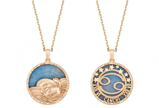 新作提供黄金和玫瑰金两个版本——黄金版以传统浮雕图案来诠释十二星座主题,你可以看到回眸的金牛、倾斜的天秤、张弓的射手,每一幅画面都展现出色的立体感;挂坠背面可以看到抽象的星座符号,并镌刻有对应星座的日期。