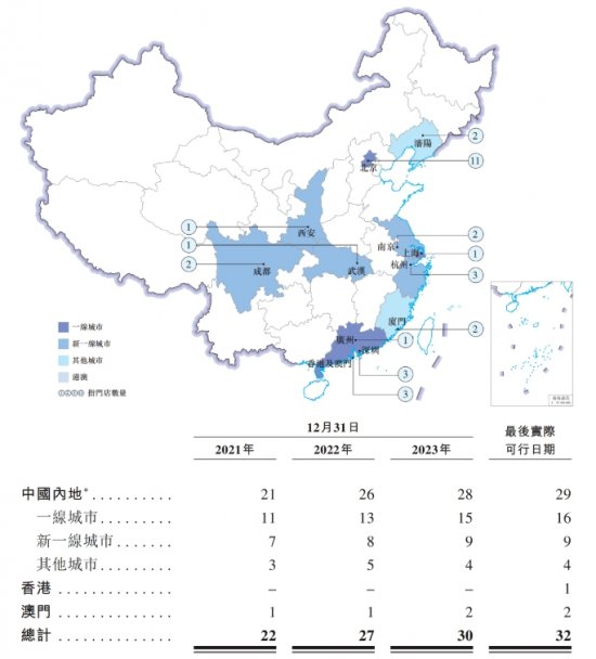 招股书显示,截至2024年5月,老铺黄金在北京、上海、深圳、南京、杭州、成都等国内一线城市和新一线城市的黄金地段开设了32家门店,且门店全部为自营门店。