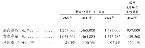 而在生产方面,公司在湖南岳阳设有一间工厂“岳阳工厂”,该工厂于2018年开业,生产区总建筑面积约1.5万平方米,截至2023年12月31日,员工人数为340人,最高产能为246万克,实际产能275万克,利用率达到111.7%。