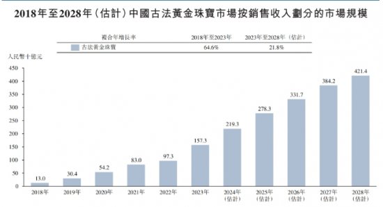 据弗若斯特沙利文资料,中国古法黄金珠宝的市场规模近几年快速增长,从2018年的130亿元增至2023年的1573亿元,复合年增长率达到64.6%,预计将以21.8%的速度增至2028年的4214亿元。