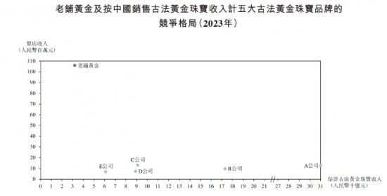 于黄金珠宝市场,于2023年按每店收入计算,老铺黄金排名中国主要黄金珠宝品牌首位(见下图)。同期,中国黄金珠宝市场的市场规模为5180亿元,老铺黄金占有0.6%的市场份额。