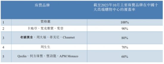 据弗若斯特沙利文资料,截至2024年4月,公司涵盖了全国十大高端购物中心中的8家,该覆盖率在国内黄金珠宝品牌中排名***。