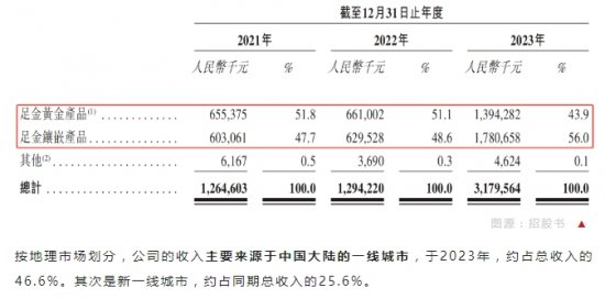 公司的所有产品均由千足金(9999)制成,视乎是否镶有钻石或其他宝石,产品类型可分为足金黄金产品及足金镶嵌产品,二者所贡献的收入占比差别不大,于2023年,分别占总收入的43.9%及56.0%。