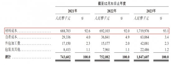 公司的销售成本包括材料成本、自产成本、外包加工费以及包装及其他费用。毫无疑问,材料成本为最主要销售成本,于2023年占比达到93.1%。