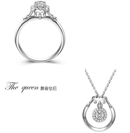 圆形辉煌宫殿和正统王冠奇妙的融合,被时光抚过变成了传奇,豪华密镶底座环绕中央钻石,成为舞会上光芒四射的皇后,流动的光彩在项间和指上灼灼生辉。