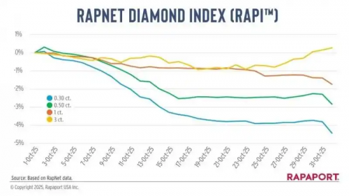 IDEX指数波动收窄,市场调整恢复能力凸显同期发布的IDEX价格报告显示,2025年10月天然钻石综合价格指数下跌幅度为0.48%,较9月的2.08%显著收窄,市场调整力度明显减弱。整个10月期间,除2日前后的短暂波动及29日前后的小幅上涨外,价格指数整体保持平稳运行,日常波动极小。